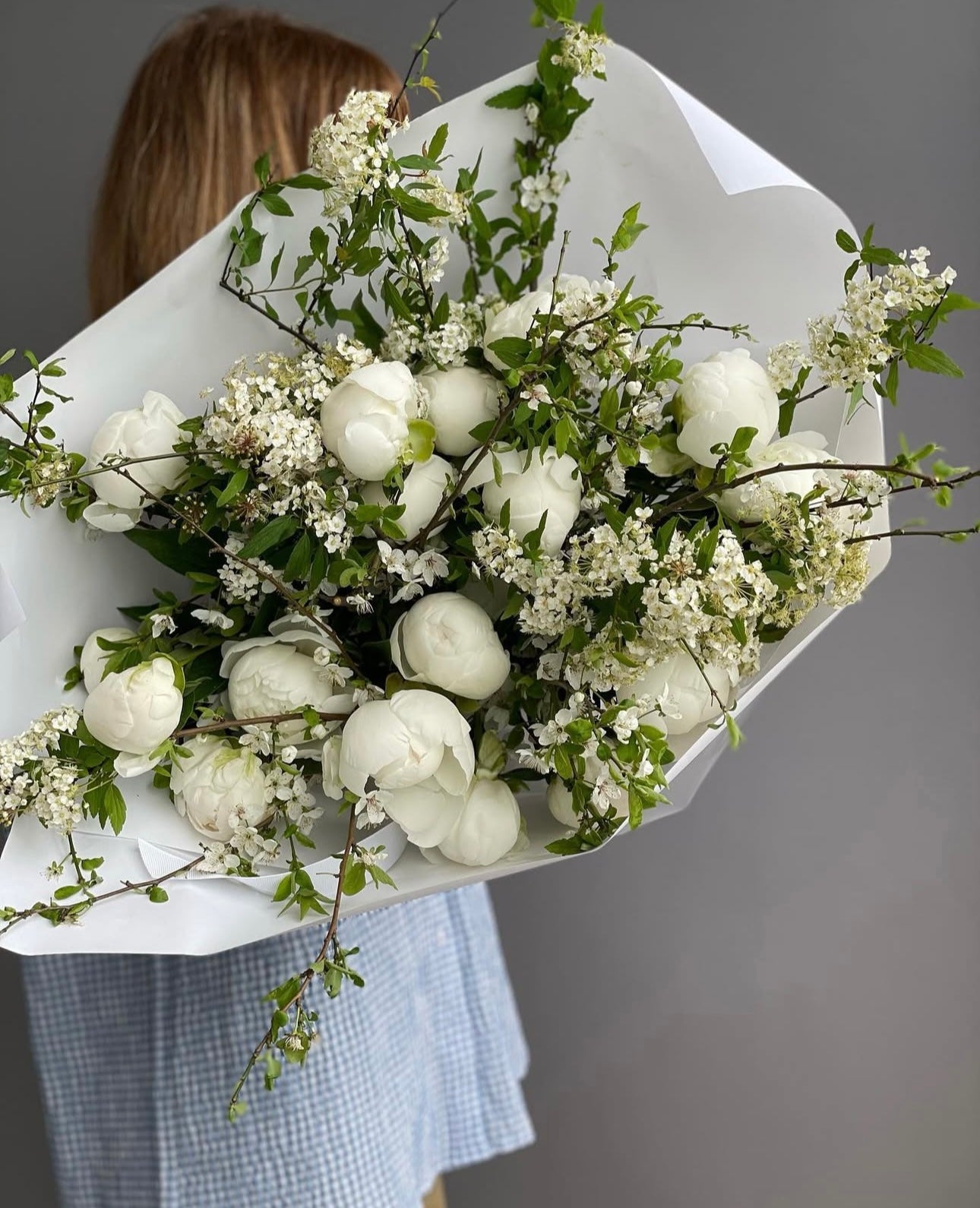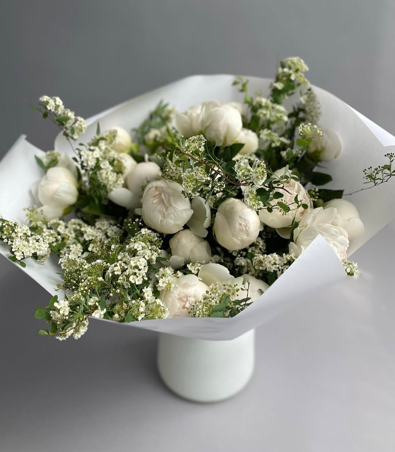 The white color of this bouquet fills the space with light and calm. A universal solution for any celebration, be it a wedding or a birthday.