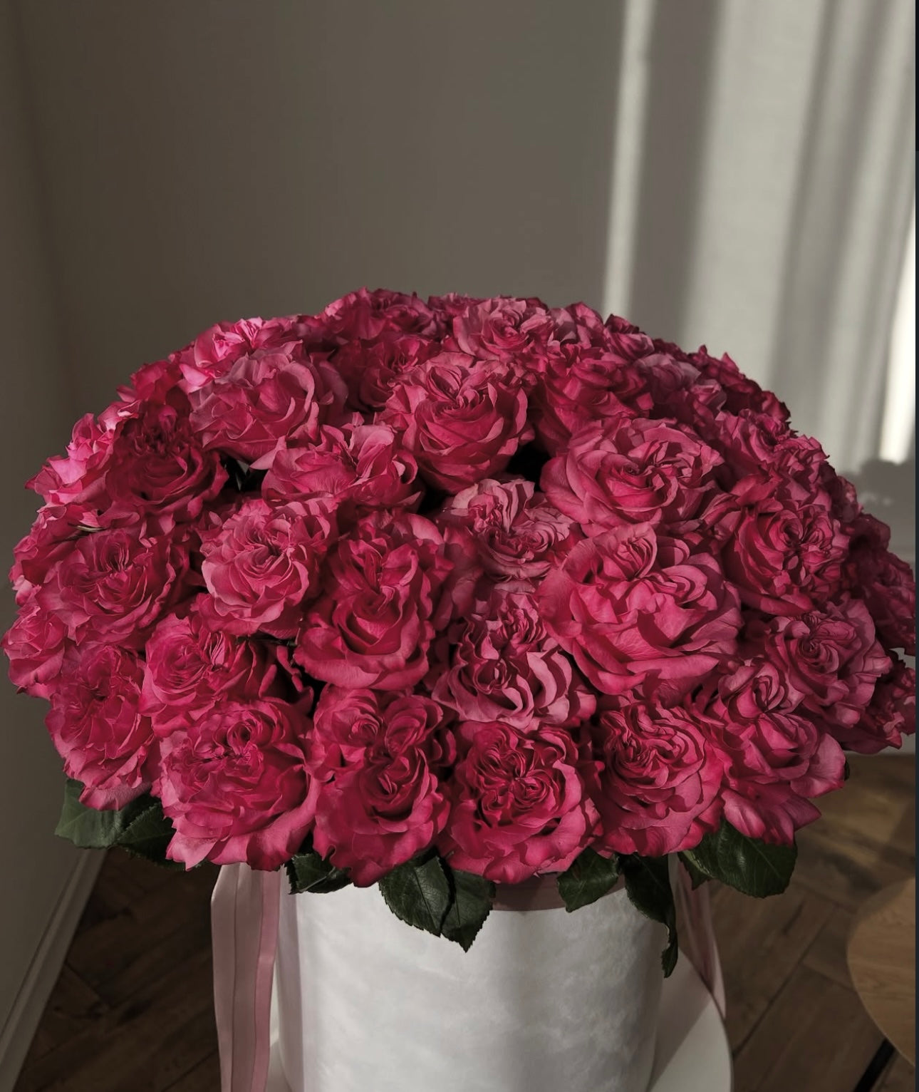 Juicy pink roses, gathered in a dense composition, create the effect of a flower cloud - bright, sensual and memorable. A white cylindrical box with delicate ribbons turns the bouquet into a full-fledged art object that you want to give and photograph.